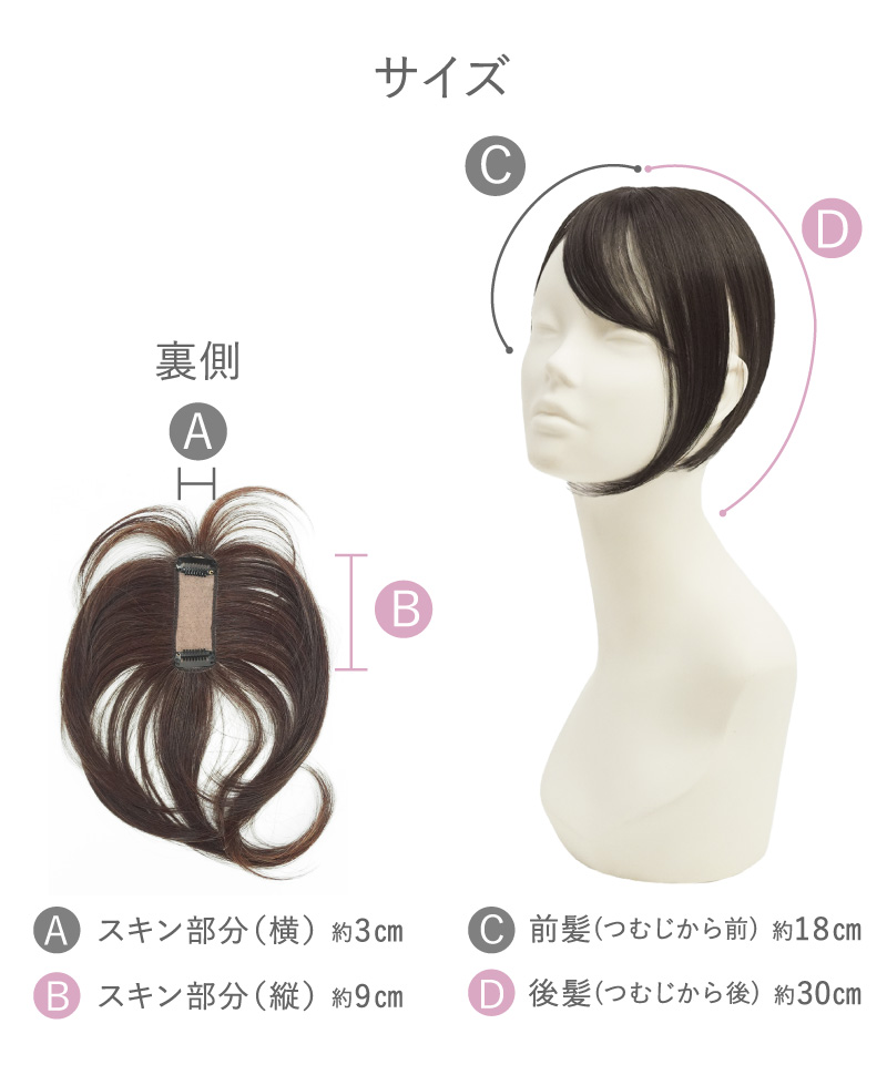 | サイズ | ■サイズ つむじから前:約18cm つむじから後ろ:約30cm スキン部分/縦:約9cm,横:約3cm 人工スキン:有り クリップ2個付き(前側:黒1個、後側:茶1個) |