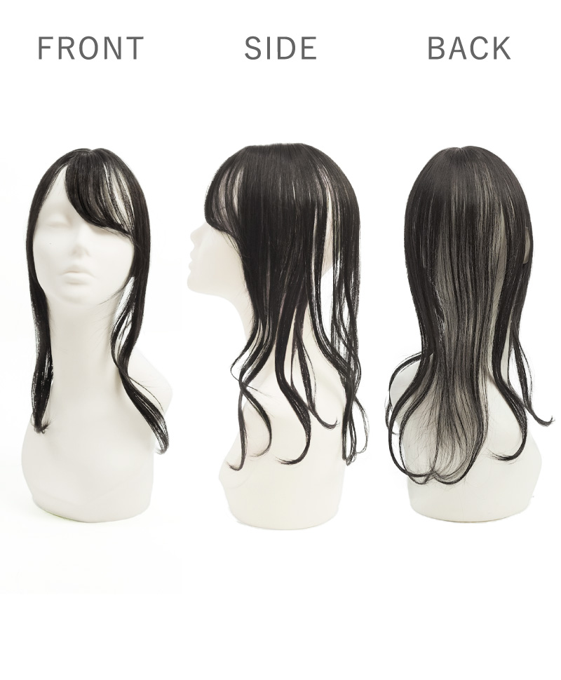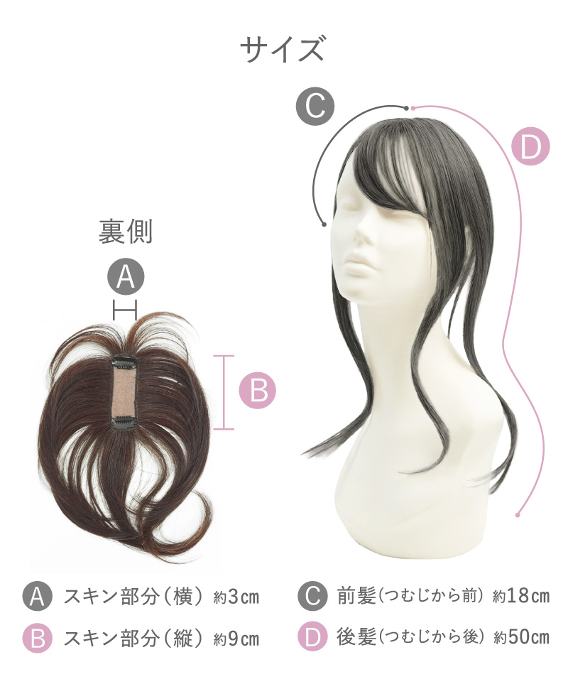 | サイズ | ■サイズ つむじから前:約18cm つむじから後ろ:約50cm スキン部分/縦:約9cm,横:約3cm 人工スキン:有り クリップ2個付き(前側:黒1個、後側:茶1個) |