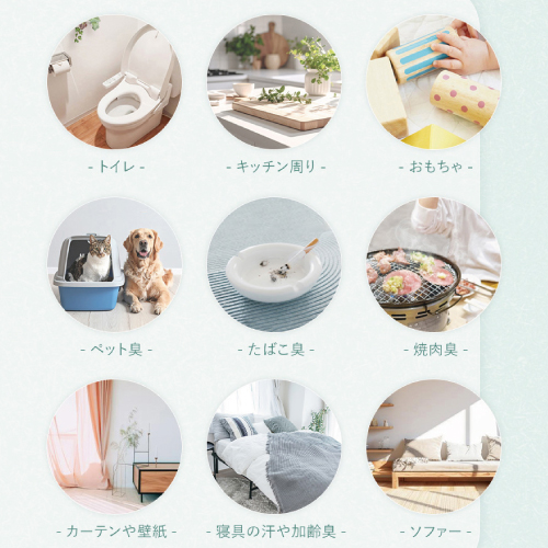 | 特徴 | <製品の特徴> 天然鉱物由来の成分を使用した特殊な技術で、多様なニオイの発生源に作用し、効果的に分解・無臭化します。 アンモニアや酢酸、イソ吉草酸等の成分の異なる多様なニオイに対しても優れた消臭効果を発揮します。 人工香料不使用でごまかさずニオイの元から消臭します。 ※全てのニオイ・菌に効果があるわけではありません。 <安全性/除菌効果> 安全性が非常に高く、肌に触れても安心してご使用いただけます。 さらに、除菌効果にも優れ、大腸菌をはじめとする雑菌の繁殖を防ぎます。 ※全てのニオイ・菌に効果があるわけではありません。 |